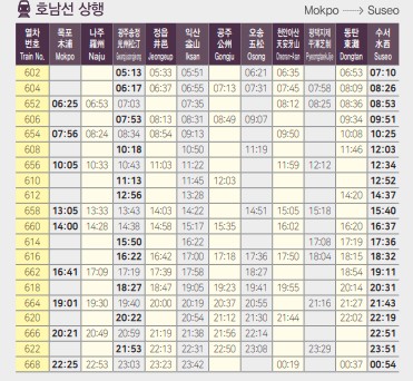 SRT기차 호남선 상행선 열차 시간표입니다.