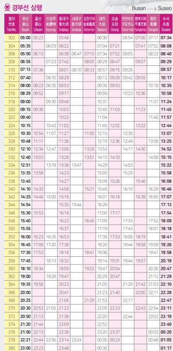 수서역에서 동탄역-평택지역-천안아산-오송역-대전역-김천구미역-서대구역-동대구역-신경주역-울산역-부산역까지 운행합니다.