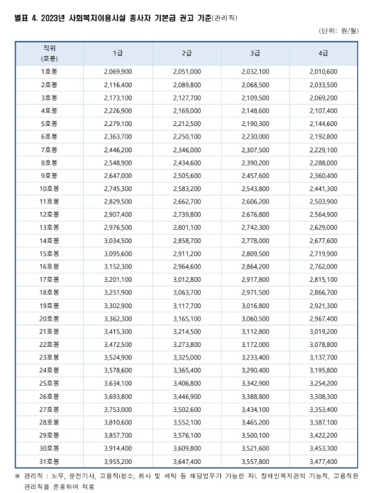 2023년 사회복지시설 종사자 인건비 직무별 권고기준입니다.