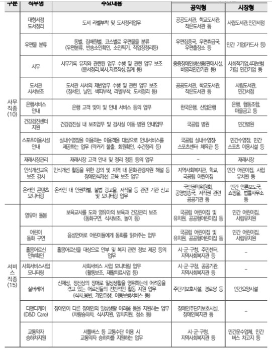 대형서점 도서정리, 서무,도서관 사서보조, 은행 서비스 안내, 건강검진센터 지원, 재래시장 관리, 인식개선교육 보조강사, 영유아 돌봄, 어린이 동화 구연, 실버케어, 어르신 안부 확인 등 다양한 업무 종류가 있습니다.
