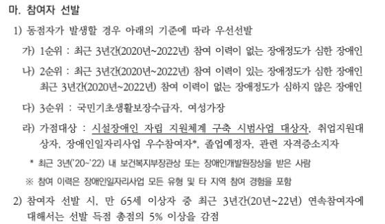 장애인일자리 사업 참여시 위 순위에 따라 우선선발 유형이 달라집니다.