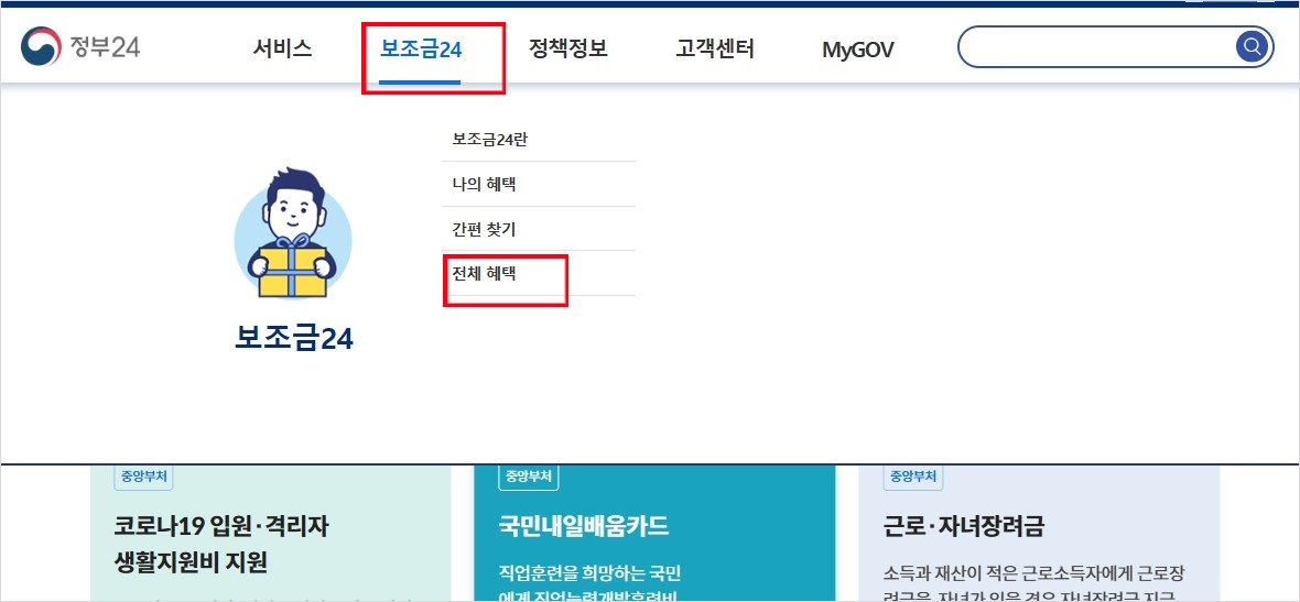 1.정부24홈페이지이에서 [보조금24]-[전체 혜택]으로 이동