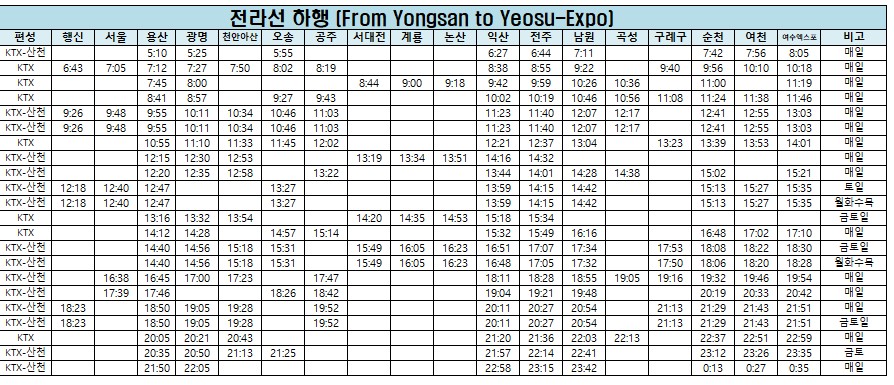 [전라선 KTX 열차 시간표]