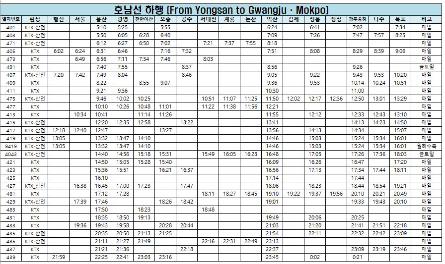 [호남선 KTX 열차 시간표]