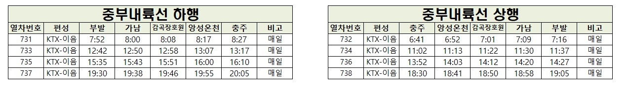 중부내력선 KTX열차 시간표입니다.