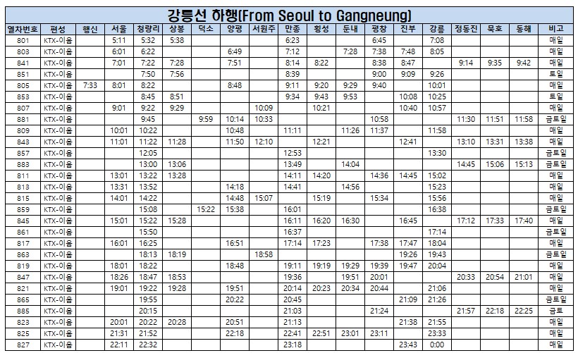 [강릉선 KTX 열차 시간표]