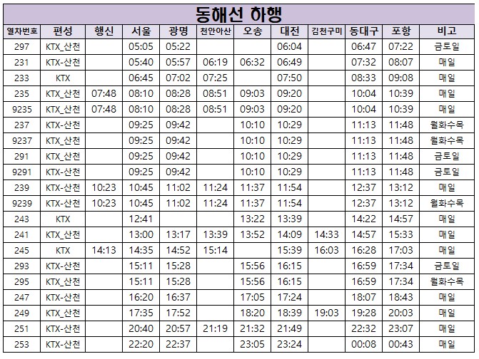 [동해선 KTX 열차 시간표]