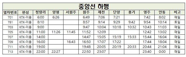 [중앙선 KTX 열차 시간표]