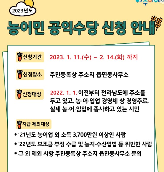 2023년 전남 농어민공익수당 신청기간은 2022년 1월 11일 부터 ~ 2022년 2월 14일까지 접수를 받습니다.
