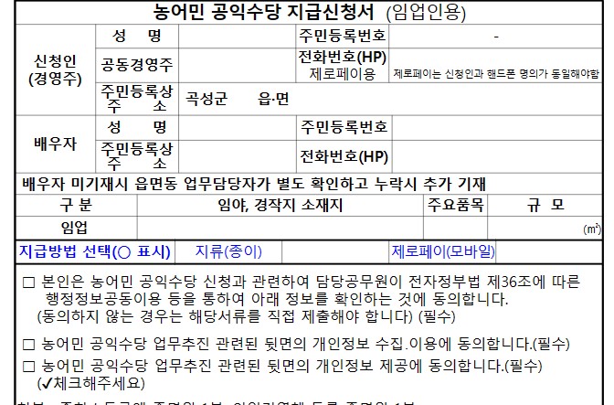 아래 전남 농어민 공익수당 신청양식을 다운로드하셔서 신청에 참고 하실 수 있습니다