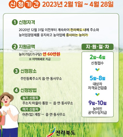 2023년 전라북도 농민공익수당은 2023년 2월 1일~2023년 4월 28일까지 신청 접수를 받습니다.