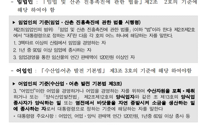 - 어업인 기준을 충족하는자 : 수산업 어촌 발전 기존법