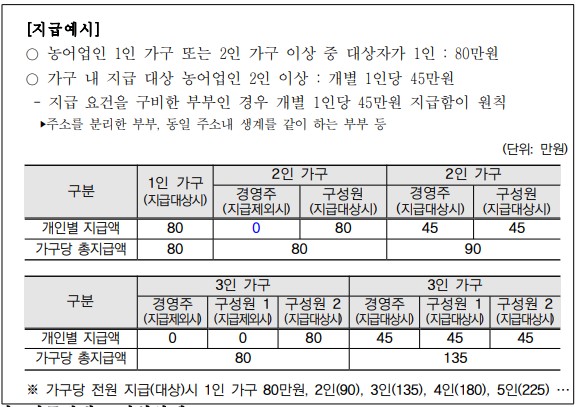 농업인 만을 대상으로 지급을 하다 최근 어업인도 추가하여 함께 지급 해오고 있습니다.