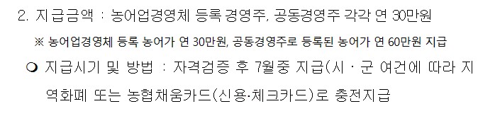 농어업경영체 등록 농어가 연 30만원이며 공동경영주로 등록된 농가 어가는 연 60만원이 지급됩니다.