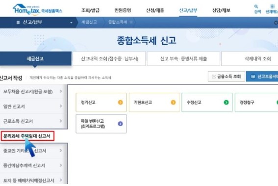 홈택스 종합소드겟 신고에서 '분리과세 주택임대 신고서'를 선택합니다.