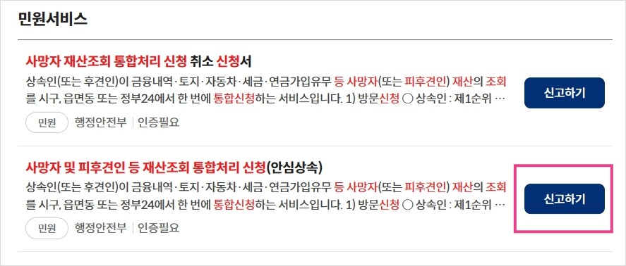 - 정부 24에서 '사망자 및 피후견인 등 재산조회 통합처리 신청' 신고하기 클릭