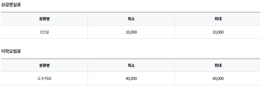 상급병실로 1인실과 도수치료 금액 등 확인할 수 있습니다.