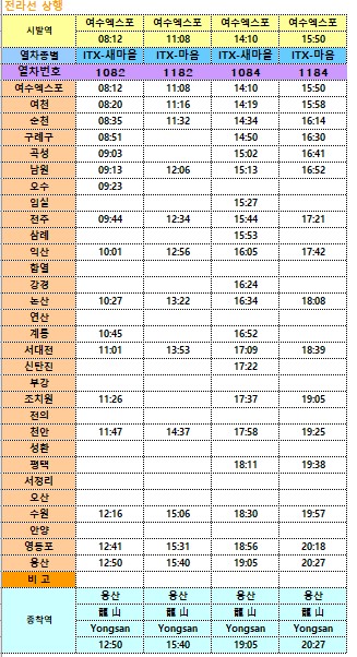 여수엑스포역에서 여천역 순천,구례구역,곡성,남원전주,익산,강경,녹산,계룡,서대전,신탄진역,조치원역,천안역,평택역,수원역,영등포역,용산역까지 운행 하는 기차 시간표입니다.