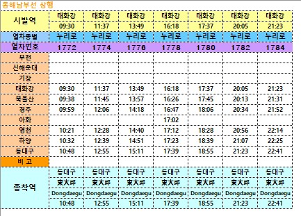 코레일 정책 및 기상상황등에 따라 기차 시간표 운임요금 등이 달라 질 수 있으므로 예매 할때 다시 확인해야 합니다.