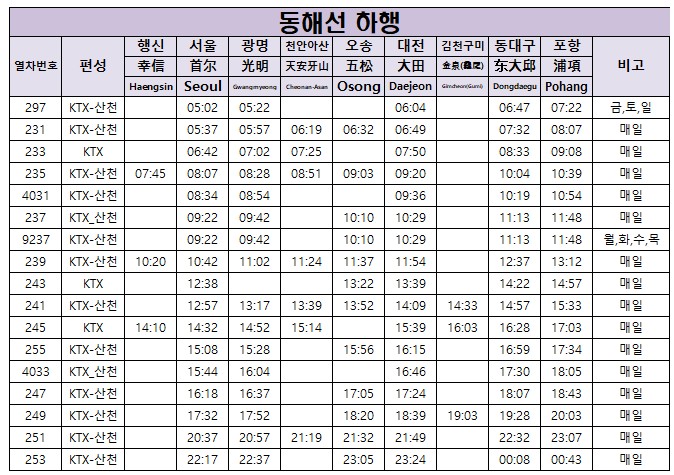 경부선 KTX하행선은 맨 아래 엑셀 첨부파일을 다운받아서 확인이 가능하빈다.