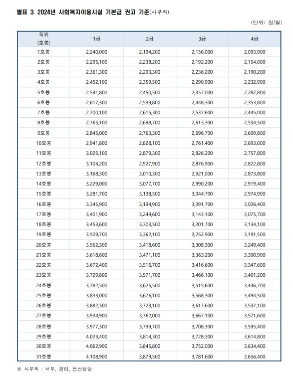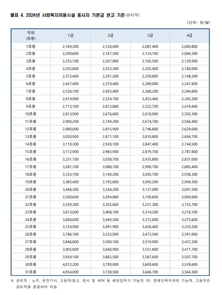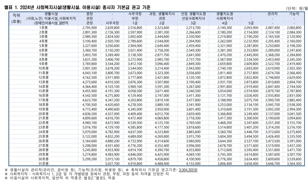 2024년 사회복지시설 종사자 인건비 직무별 권고기준입니다.