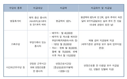 사회복지시설 종사자 수당 기준으로 명절휴가비,가족수당, 시간외 근무 수당입니다.