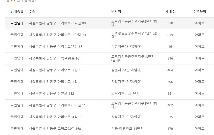 | 국민임대 | 서울특별시 강동구 상일로 152 | 고덕리엔파크1단지 | 181 |