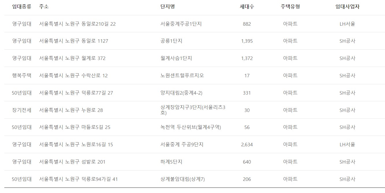 - 해당하는 서울시 노원구 임대주택 정보 확인