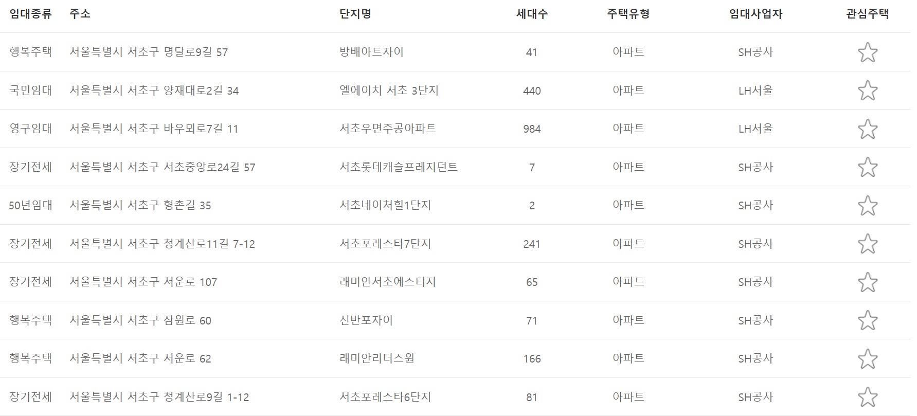 서울시 서초구 지역의 임대주택 리스트 현황 입니다.