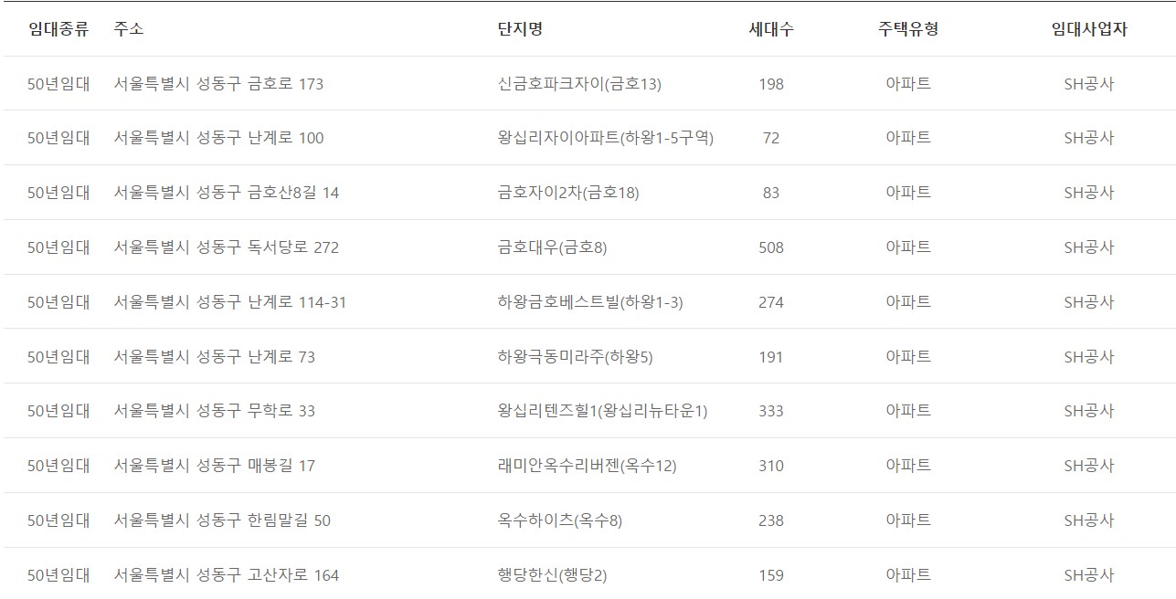 서울시 성동구 임대아파트 리스트 | 국민,공공,영구,통합,행복 임대주택 | 보증금 임대료 현황 조회