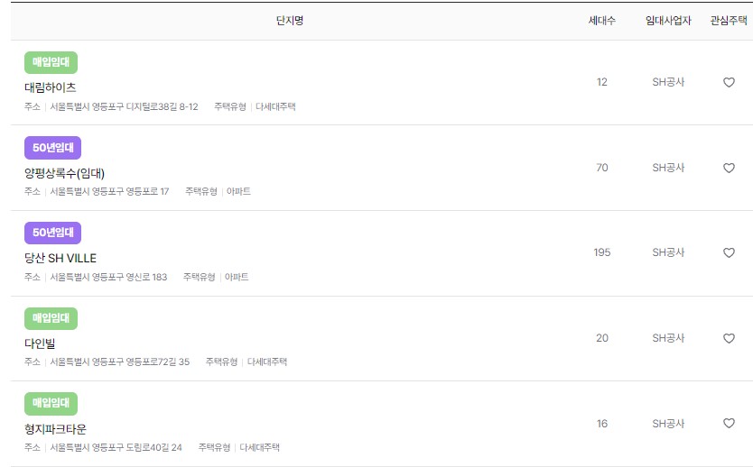 | 50년임대 | 서울특별시 영등포구 영신로 183 | 당산 SH VILLE | 195 |