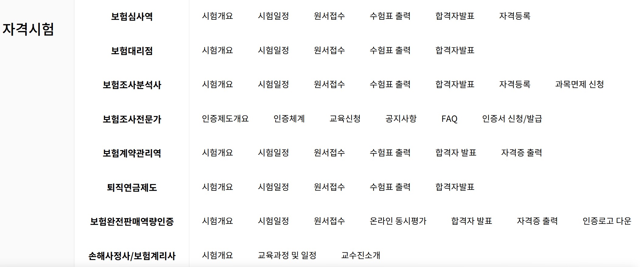 보험심사역,보험대리점,보험조사분석사,보험조사전문가,보험계약관리역,퇴직연금제도,보험완전판매역량인증,손해사정사,보험계리사 등의 자격 시험이 있습니다.