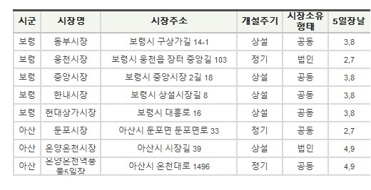| 보령 | 한내시장 | 보령시 상설시장길 8 | 상설 | 공동 | 3,8 |