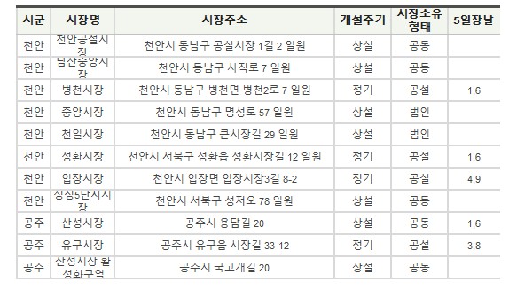 | 천안 | 천안공설시장 | 천안시 동남구 공설시장 1길 2 일원 | 상설 | 공동 | - |