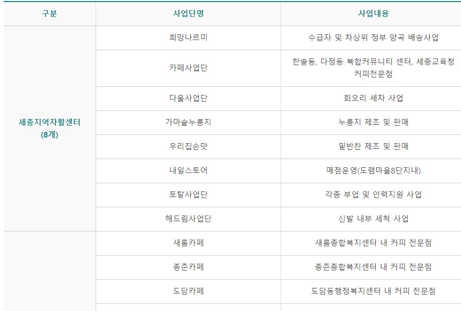 도시락 배송, 음식점, 청소업체 창업, 장애아동 도우미,재활용청소,간병도우미,미용, 요리,전기,용접,정비,제과제빵,청소 등 다양한 사업 종류가 있습니다.