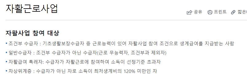- 조건부 수급자 : 자호라근로사업은 조건부 사업자를 우선 선정하도록 되어 있습니다.