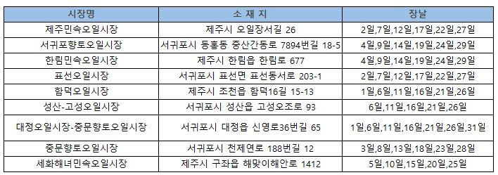 제주도 오일장 장날표 5일장 일정입니다.