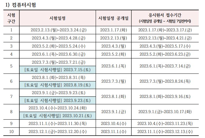 10 | [토요일 시험시행일] 2023.9.23.(토) | 2023.8.1.(화) | 2023.8.1.(화)~2023.9.16.(토) |
