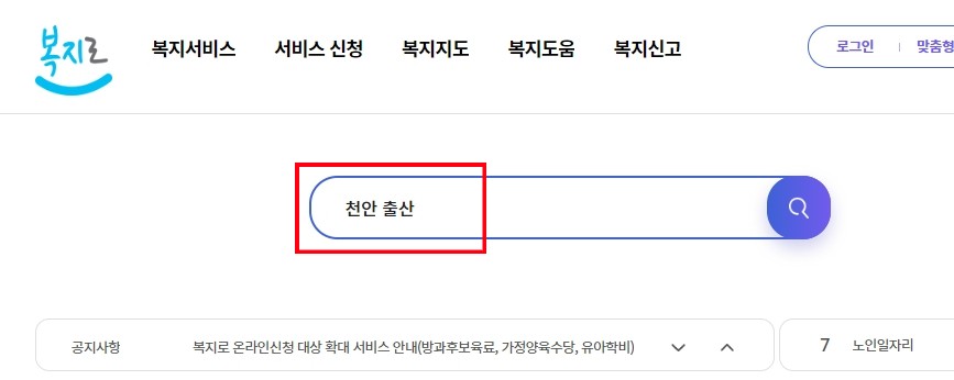 복지로사이트 검색창에서 '내가 사는지역 출산장려금'을 검색합니다.