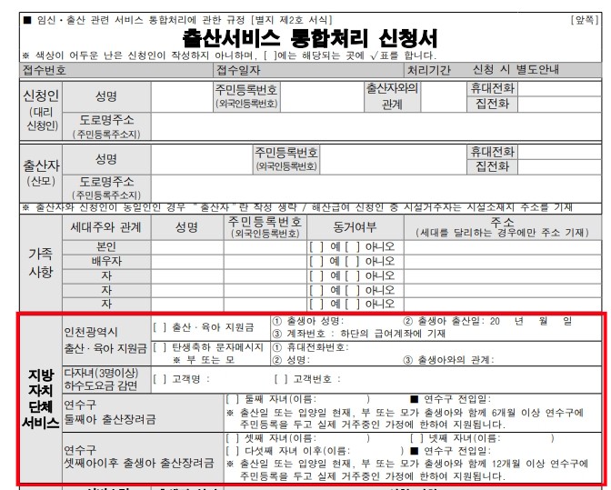주로 출산서비스 통합처리 신청서에서 지방자치단체 서비스란에 작성하면 출산신고와 함께 한번에 처리할 수 있습니다.