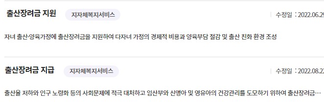 해당 사이트에서 출산-출산지원금으로 가면 각 지역별 출산 축하금,출산장려금, 신생아 양육비 등을 조회 할 수 있습니다.