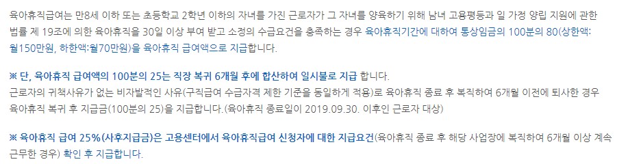 무급인 대산 정부에서 일정 금액을 지급하여 육아휴직으로 인한 경제적인 어려움을 해소 할 수 있도록 보조해 줍니다.