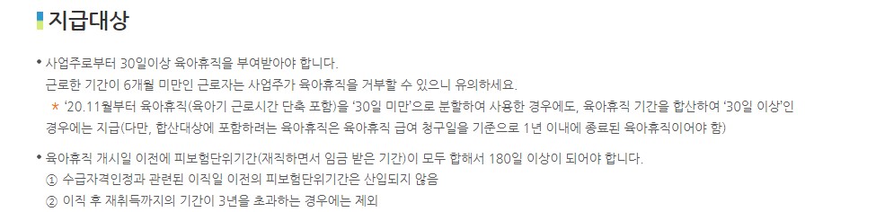 고용보험에 가입한 기간이 육아휴직 신청이전에 180일 이상이 되어야 합니다.