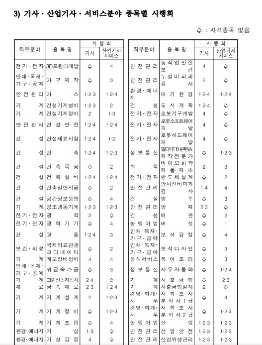 산업기사와 기사 시험 종류와 유형별 시험 횟수 입니다.