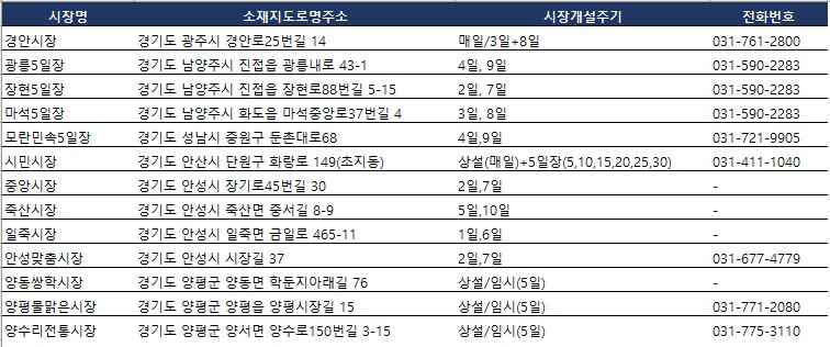 | 경안시장 | 경기도 광주시 경안로25번길 14 | 매일/3일+8일 | 031-761-2800 |