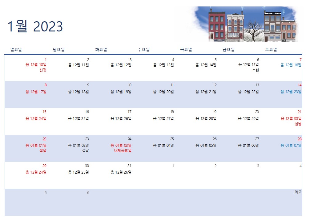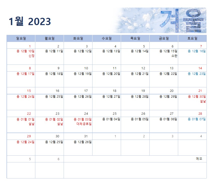 이상으로 2023년 1월 달력 프린트 다운로드(무료 엑셀,pdf 양식,음력 포함)에 대해 확인해 보았습니다.