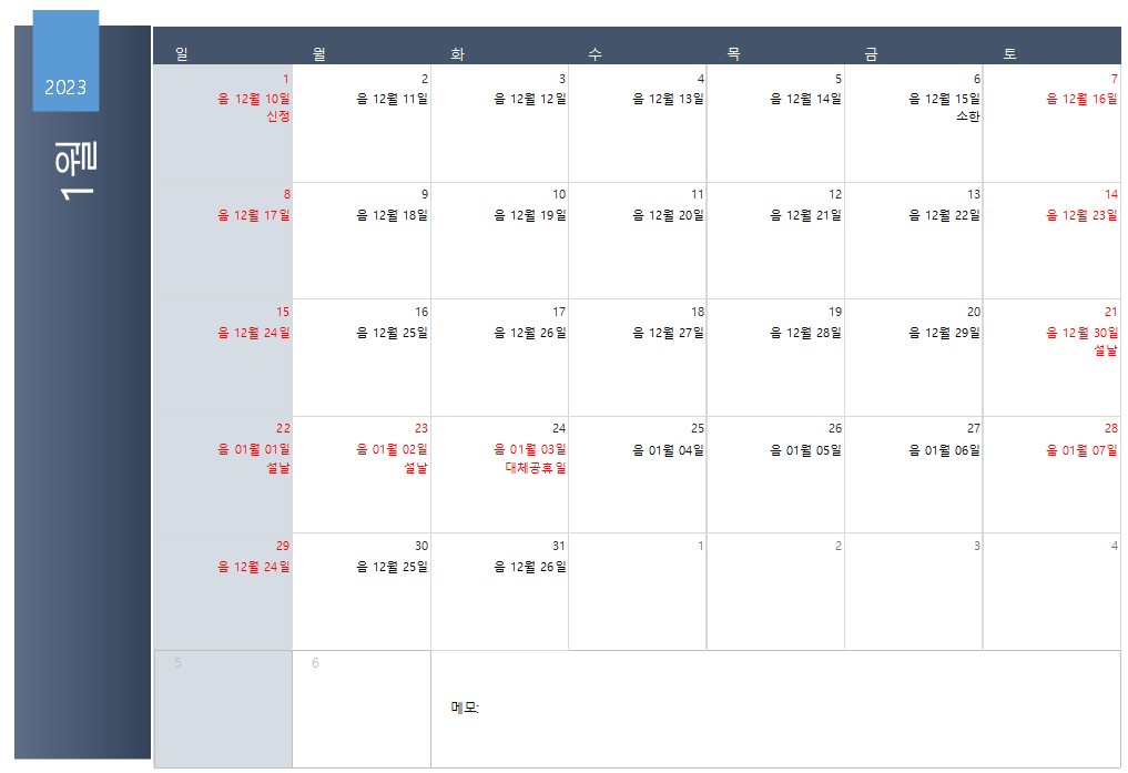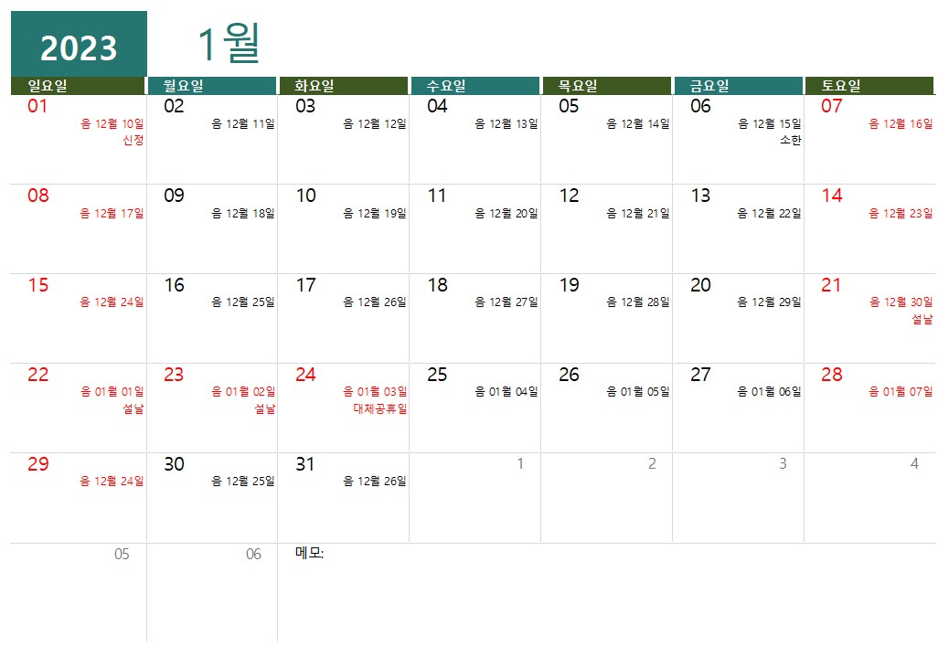 2023년 1월 달력 프린트 다운로드(무료 엑셀,pdf 양식,음력 포함)입니다.