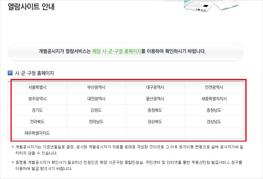 개별공시지가는 지자체에서 고시하는 가격이므로 각 지역으로 클릭해 이동합니다.