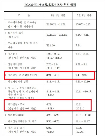 2023년 개별공시지가 조회 일정은 2023년 3월 말부터 임시 조회가 가능해 집니다. 공개 이후 만약 토지 가격에 이의가 있다면 일정 조회 기간을 거친후 2023년 4월 말부터 공식 확정되어 조회가 가능합니다.