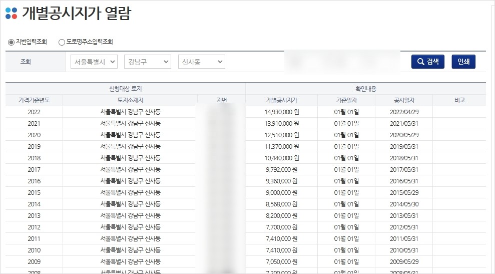 해당 주소를 입력하면 각 년도별 개별공시지가를 조회 할 수 있습니다.